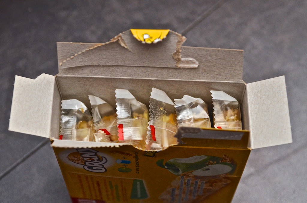 Chaque barre est emballée séparément ce qui est très pratique pour un usage nomade et conserver la fraîcheur du produit. L'emballage est en plastique fin et transparent. Il est frappé des logos LU et Grany en couleurs. La variété et la DLUO sont aussi indiquées. L'emballage est bien fait, remplit efficacement son rôle et est facile à ouvrir.