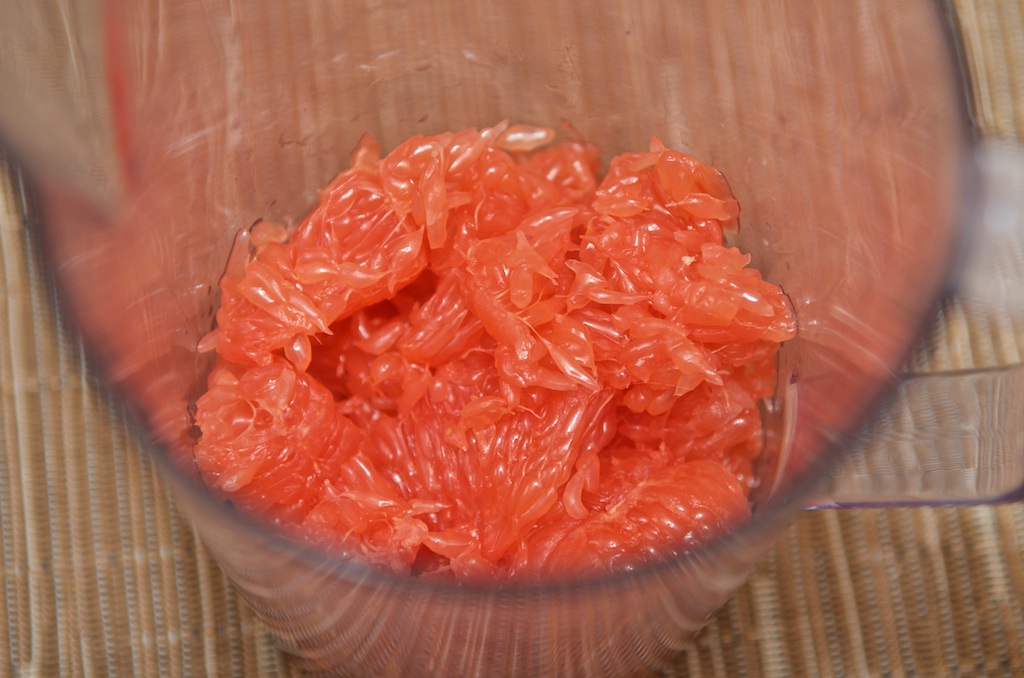 Pendant ce temps on passe à la préparation de la gelée de pamplemousse. ll faut d'abord bien retirer les membranes de tous les quartiers de pamplemousse puis les mixer.